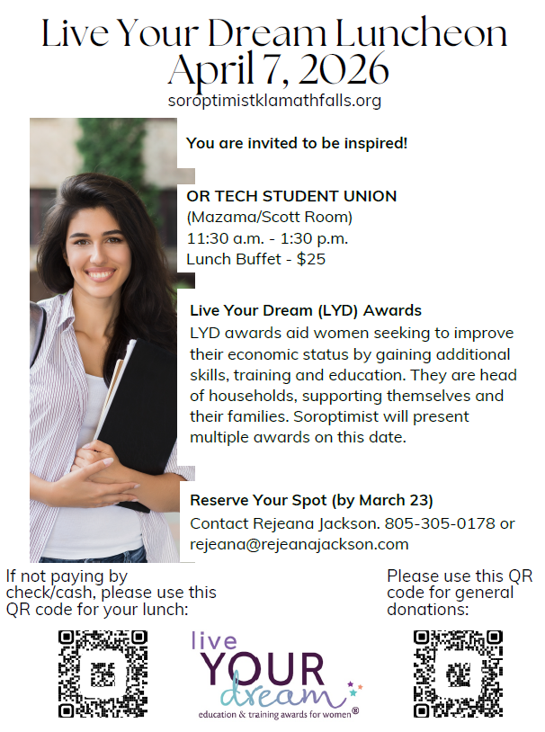On March 17, 2023 Soroptimists of Klamath Falls and their friends will gather to celebrate the 2022/23 Live Your Dream Award recipients. This year’s first place recipient will receive $2,500, there was a tie for second place with each winner taking home $1,250. New this year is the Dream Investment Award with a $1,000 monetary award.